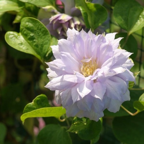 Листья тройчатые, зеленые, среднего размера. Основная декоративность сосредоточена в цветении. Зацветает на 2–3 год. Первая волна цветения начинается в мае–июне и продолжается до 4 недель. Цветки крупные, 12–15 см, густомахровые, с множеством узких лепестков. Окрас серебристо-голубой с лиловым оттенком. Вторая волна цветения приходится на август–сентябрь, цветки становятся полумахровыми или простыми.