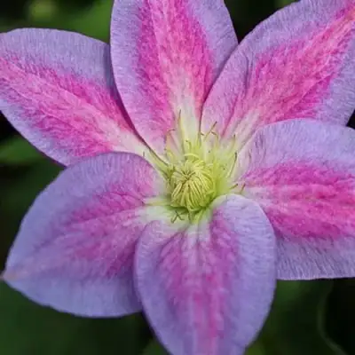 Цветет длительный период: с мая по июль на новых побегах и прошлогодних, нередко культура сорта цветет повторно. Цветок простой формы с 6 чашелистиками. Размер средний – около 10-13 см. Отличается от других за счет своего интересного окраса, который за период цветения меняется от пурпурно-красного до светло-розового. При появлении цветки имеют пурпурно-красный цвет, на пике цветения – красно-розовый, а по окончании они светлеют. Также у чашелистиков имеется светло-розовая, слегка голубоватая окантовка и светлая, почти белая у основания, полоса посередине. В сердцевине цветка располагаются тычинки с желтыми пыльниками на нитках зеленого цвета и со столбиками желтого оттенка.