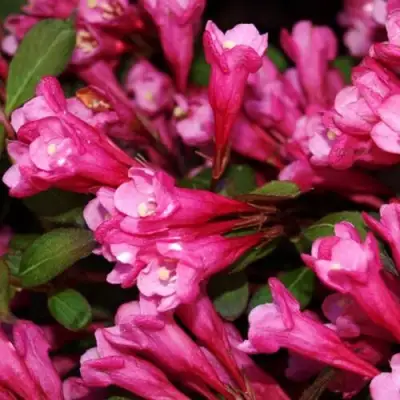 Цветение вейгелы начинается в конце весны и продолжается до июля. Цветы формируются в соцветиях и имеют характерную колокольчатую форму, способную достичь в диаметре 3,4–4,0 см. Обилие ярко-розовых цветов с приятным средним ароматом словно привлекает внимание, создавая удивительное настроение в вашем саду. Цветение происходит на прошлогодних побегах, периодически кустарник может радовать вас повторным цветением.