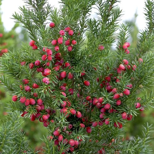 Плоды у тиса среднего Хикси костянки, а не шишки, как у других хвойников, созревают к концу лета и держатся на ветках до поздней осени.