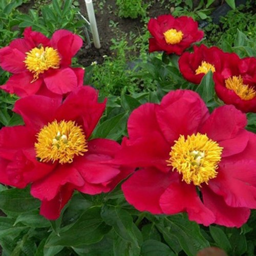 Цветение "Америки" – это настоящее зрелище. Его крупные цветы имеют диаметр свыше 20 см и обладают насыщенным ало-красным оттенком, который просто притягивает взгляд. Леапестки имеют чашевидную форму, гофрированную структуру и расширяются к краям, что придает цветкам выразительность. Ярко-желтые тычинки собраны в плотный помпон, а желто-зеленый пестик с белым рыльцем дополнительно добавляет эстетического очарования, а его края окрашены в бледно-розовый цвет. Аромат пиона "Америка" еле уловимый.