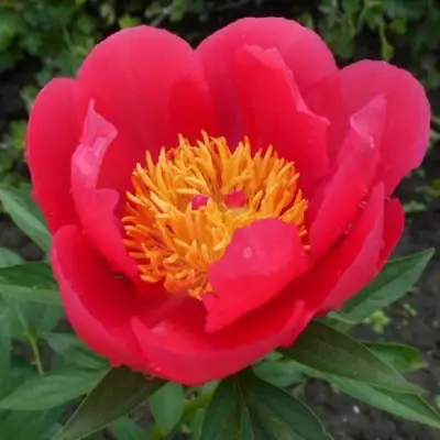 Цветки пиона 'Москва' — настоящее произведение искусства. Они полумахровые, крупные, достигающие в диаметре до 10 см. Окраска цветков рубиново-красная, насыщенная и яркая. Более того, чашевидные цветы украшены длинными, пушистыми, жёлтыми тычинками, излучающими лёгкий и приятный аромат. Эти растения изумительно смотрятся на альпийской горке и радуют глаз своим разнообразием и красотой.