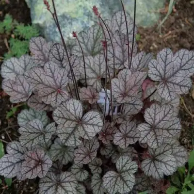 Листья этого сорта небольшие, округлой формы, с насыщенной бордовой окраской, дополненной серебряным напылением. Темно-бордовые прожилки придают листве изысканный вид. Стоит отметить, что цвет листьев не меняется в течение сезона, что делает гейхеру Шуга Фростинг идеальным вариантом для создания стабильного цветового акцента в вашем саду. Матовая поверхность листьев придает им неповторимый шарм и естественность.