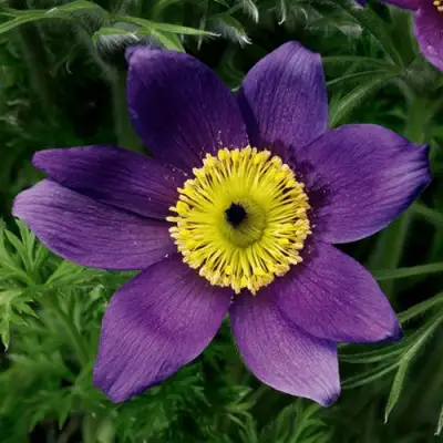 Окрас играет переливами: от насыщенного синевато-фиолетового до глубокого лилового. На солнце поверхность лепестков выглядит бархатной с лёгким глянцевым блеском, а золотисто-жёлтые тычинки внутри придают цветку яркий акцент. Центральная часть иногда переливается серебристым отливом, подчёркивая необычную цветовую палитру. Такая контрастная композиция делает прострел одним из самых эффектных раннецветущих растений.