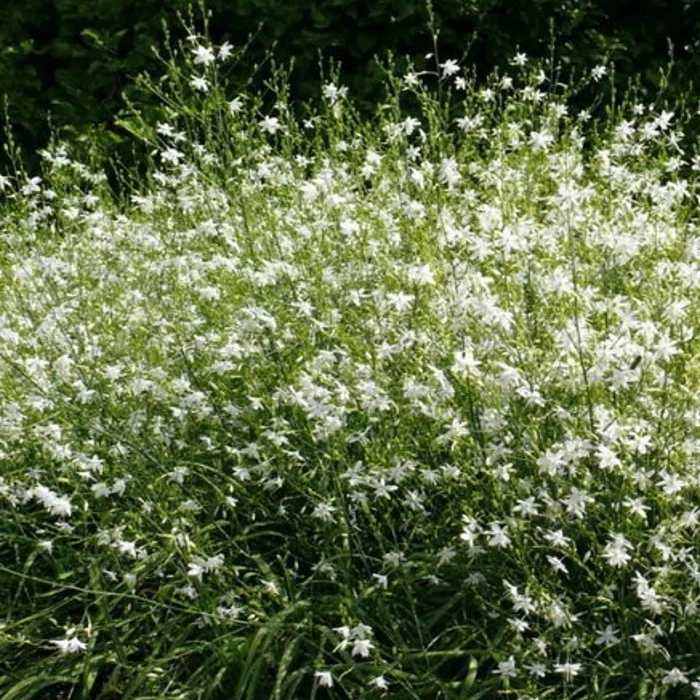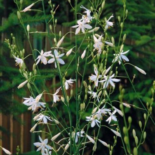 Многолетник, происходящий из Европы, растёт компактно, формируя прикорневую розетку из узких желобчатых листьев. Высота растения — от 30 до 50 см. Листва насыщенно-зелёная, с едва заметным сизым налётом. Цветоносы прямые, безлистные, образуют разветвлённые метёлки, на которых раскрываются белые звёздчатые цветки. Диаметр каждого — около 1,5 см. Цвет лепестков — холодно-белый, пыльники ярко-жёлтые, что создаёт выразительный контраст.