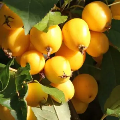Плоды яблони колонновидной Голден Хорнет имеют насыщенную желтую окраску и имеют сферическую форму с размером около 30 мм. Вкус плодов немного терпкий, что делает их интересными для использования в кулинарии.
