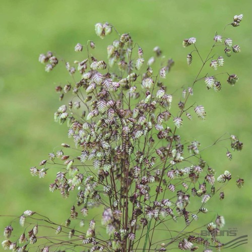 Цветение — эстетическая кульминация. С мая по июль над листвой поднимаются ажурные метёлки, усыпанные поникающими колосками — в форме капель или сердечек. На старте они зелёно-розоватые, ближе к лету становятся золотистыми. Размер одного колоска — до 1 см, длина метёлки — до 7 см. Даже слабый ветер приводит их в движение, создавая эффект «живой» текстуры. А вот аромата у цветков нет, что делает растение универсальным — оно не отвлекает внимание и не провоцирует аллергию.